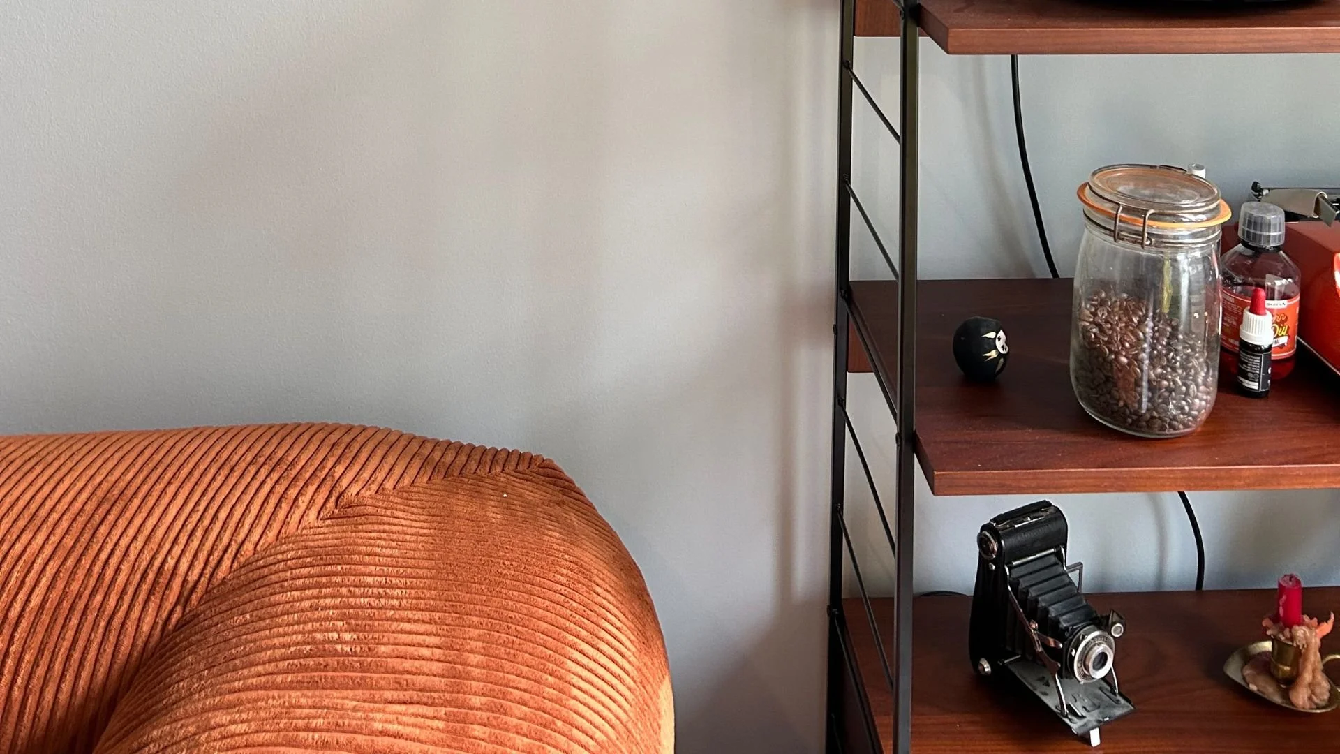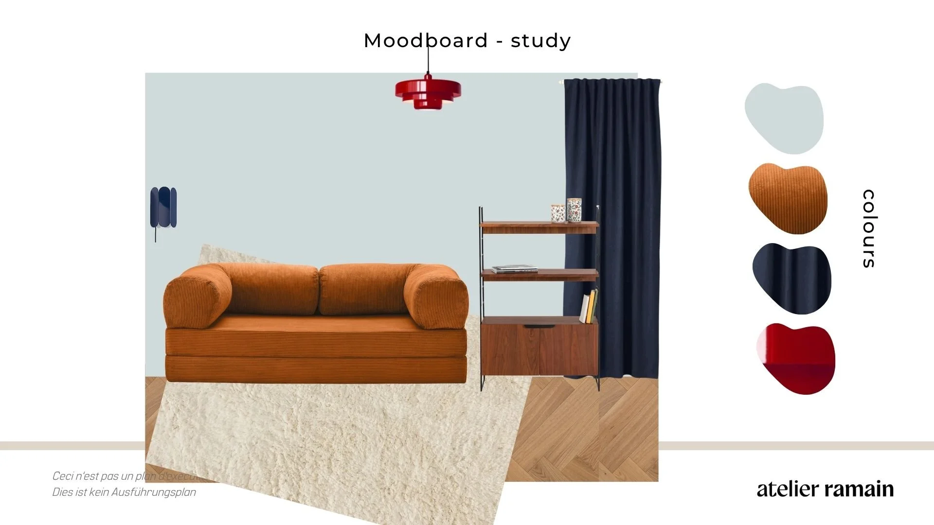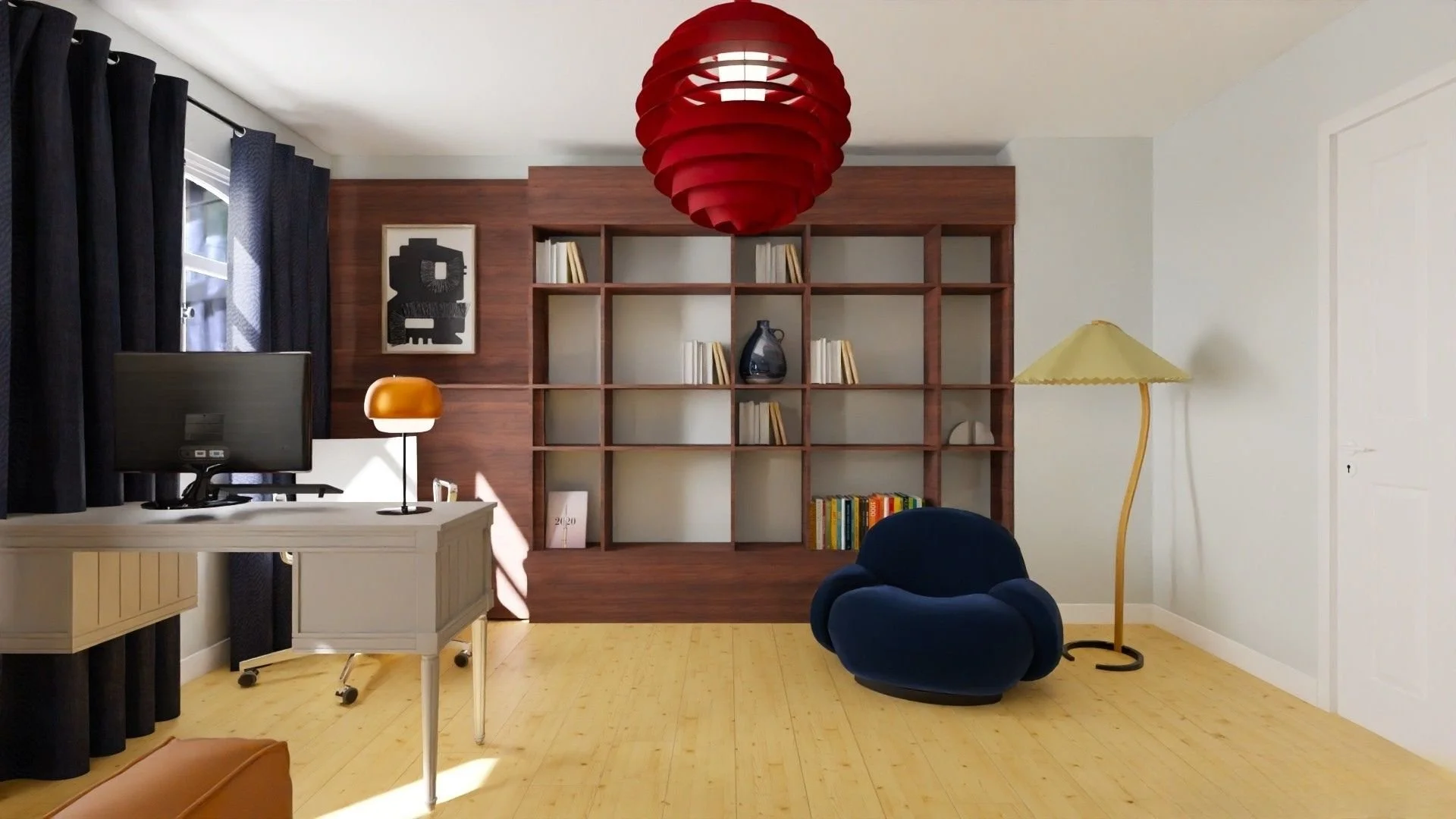 Project Luni is a charming Berlin Altbau rental that already had great bones and a beautiful selection of vintage pieces that just needed the right background to shine. I transformed the long hallway into an art gallery with a bold colour statement, added warmth and cosiness to the white walls in the bedroom and living room, and gave the study a refreshing twist with light blue tones, a touch of 70s spirit, and a custom cabinetry plan combining functionality with style. The orange sleeping couch, deep blue accents, and playful pops of red complete the look with a unique, eclectic feel.